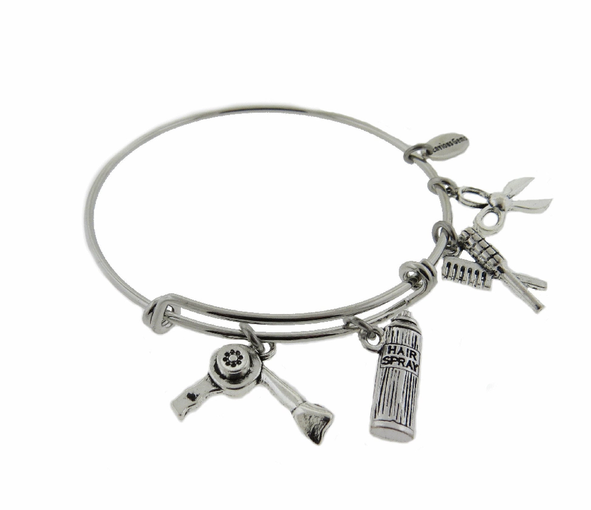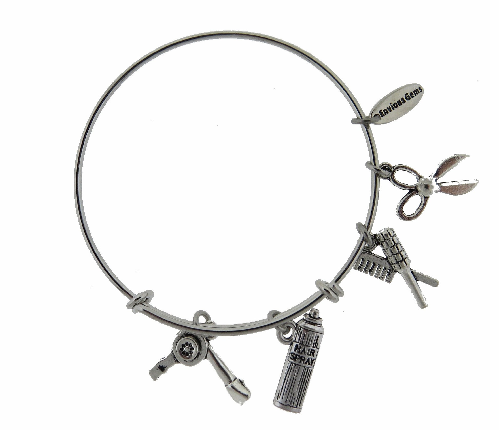 This Bracelet comes with many Charms, Starting with a 3-D "Hair dryer" along with a 3-D "Hair Spray" can Charm, also attached are a scissors charm and a Brush and Comb Charm