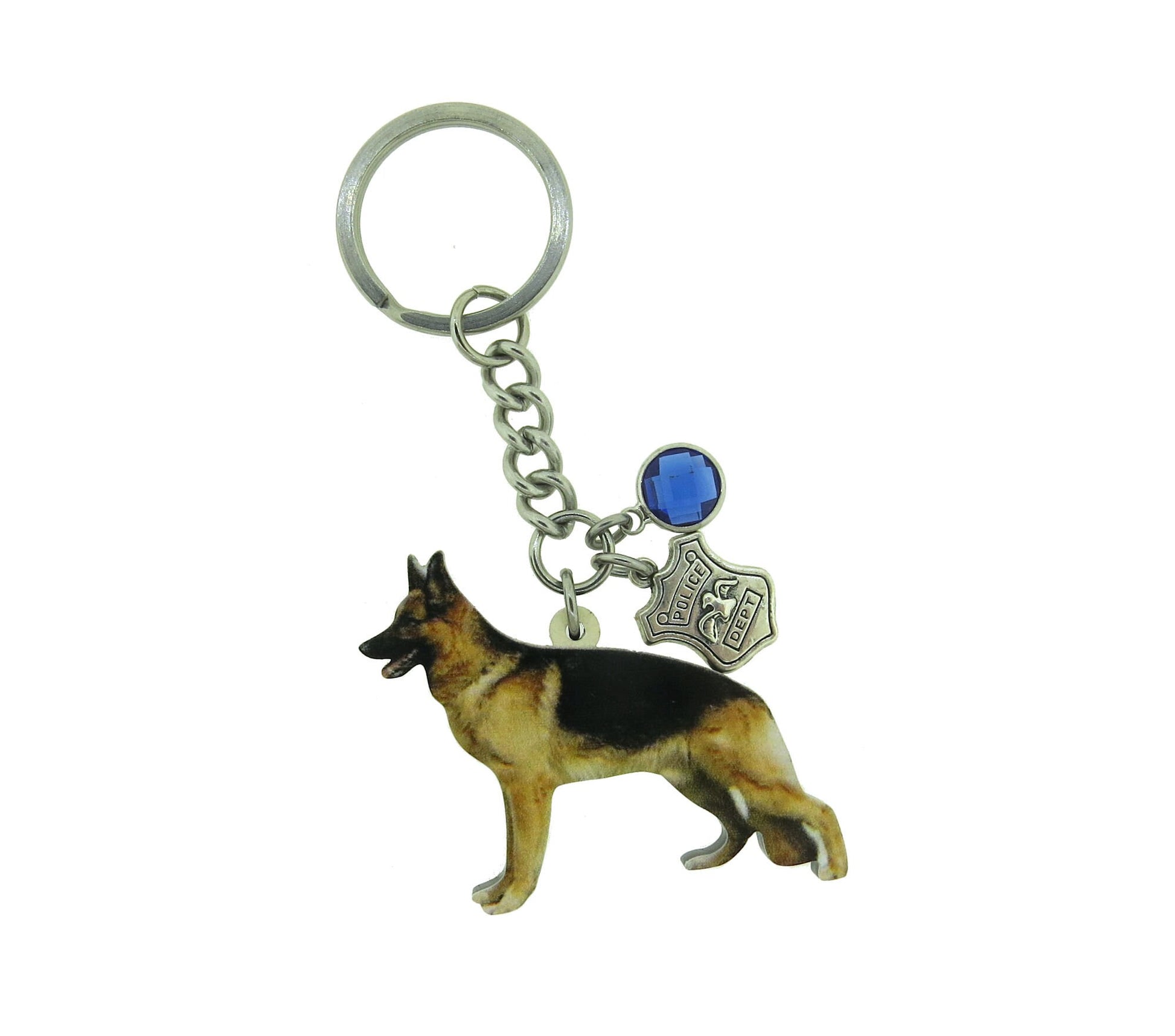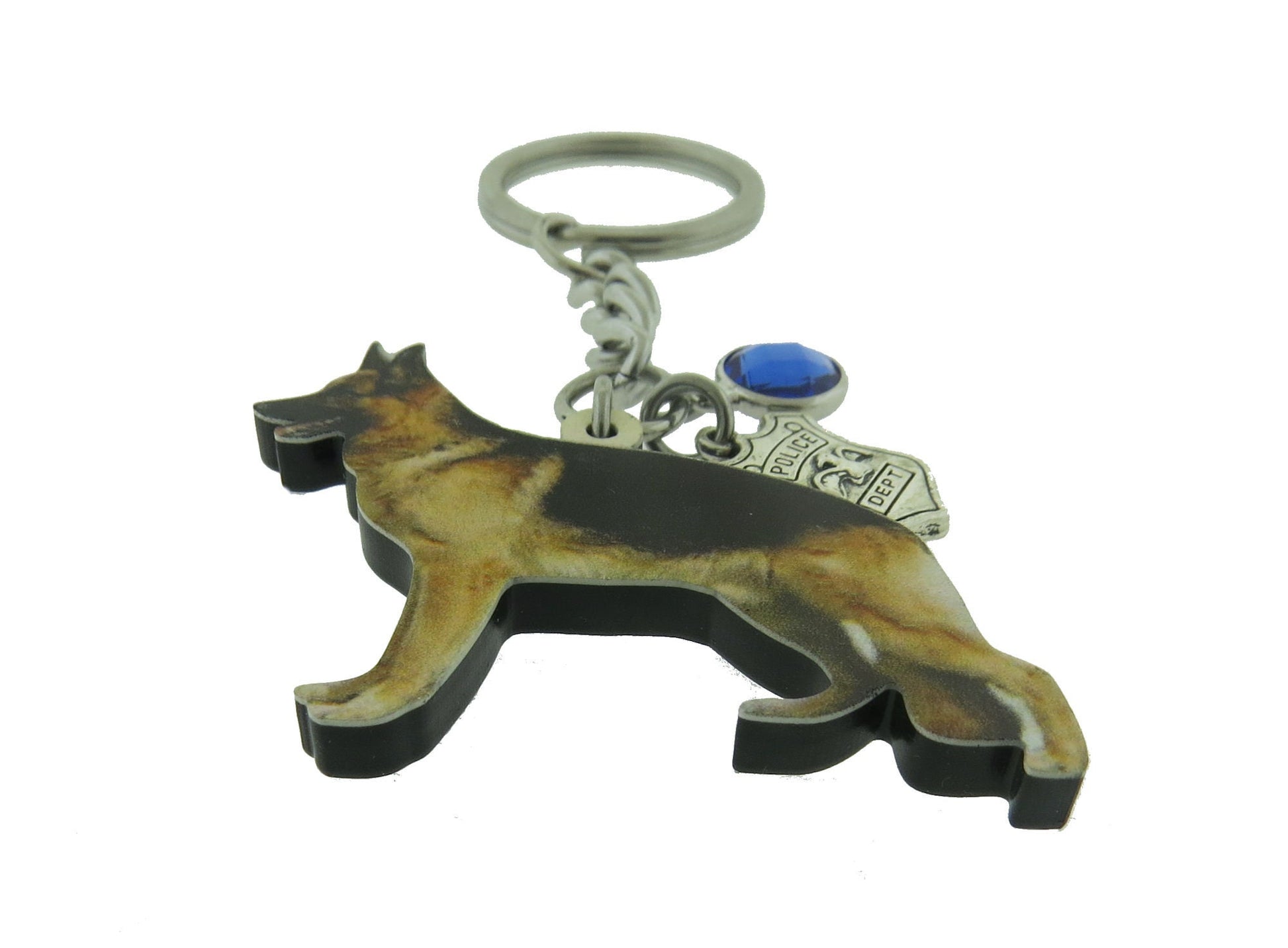 This Police K-9 Keychain comes with Three Charms, Starting with a German Shepherd Dog Pendant, Police Dept. Badge / Shield, and a Blue Crystal charm.